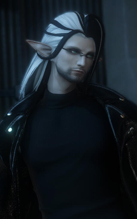Notable Appearance Details: Ashen Grey Skin, Bright green eyes and the features that denote old Ishgardian bloodlines. His deep voice is deep in that old Ishgardian accent. His body is littered with tattoos including one hand being inked to black. His reputation as a lone wolf represented by the wolf in the wolf tattoo he got to embrace the rumors.