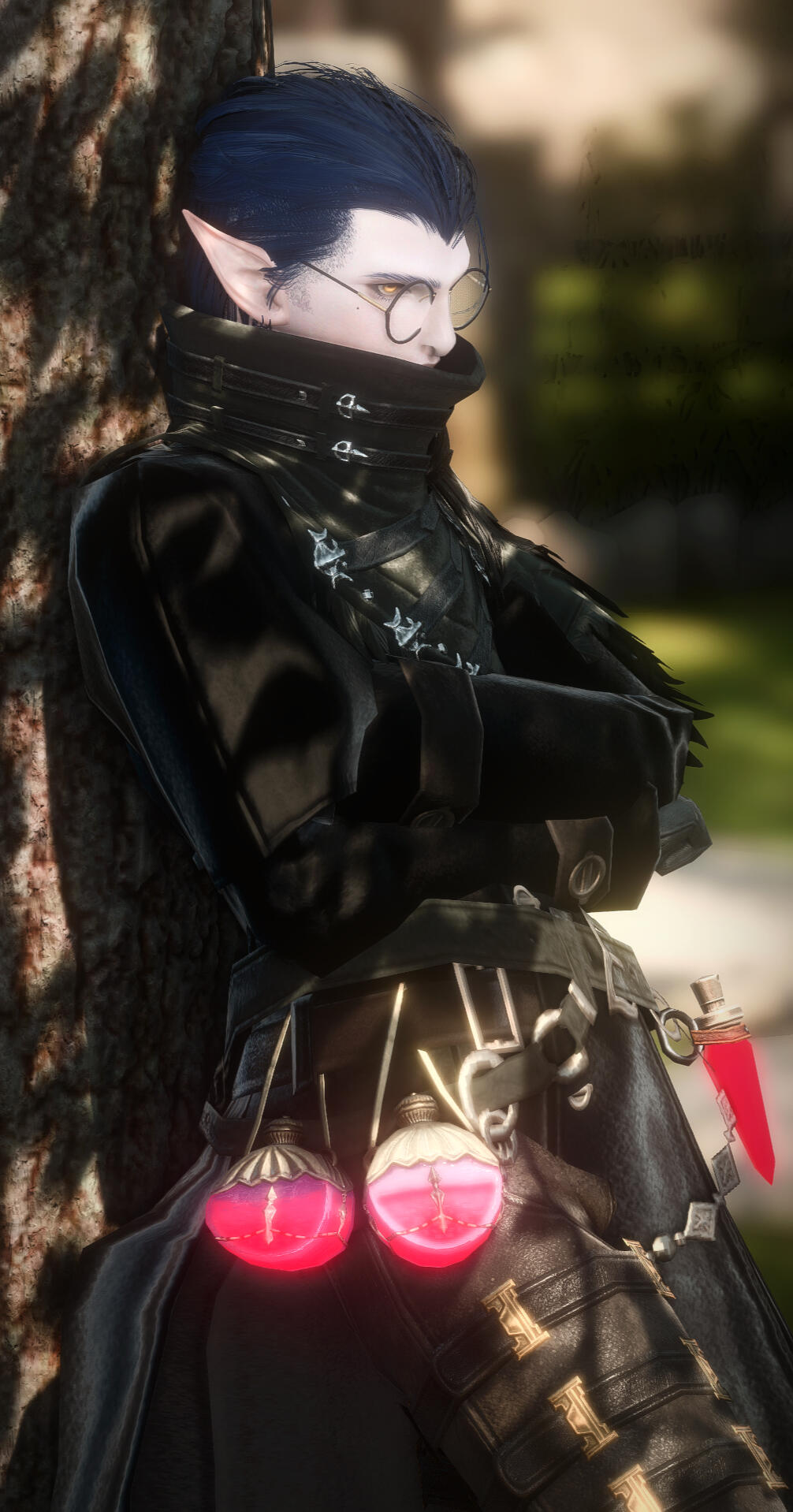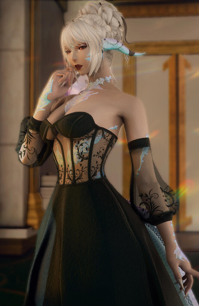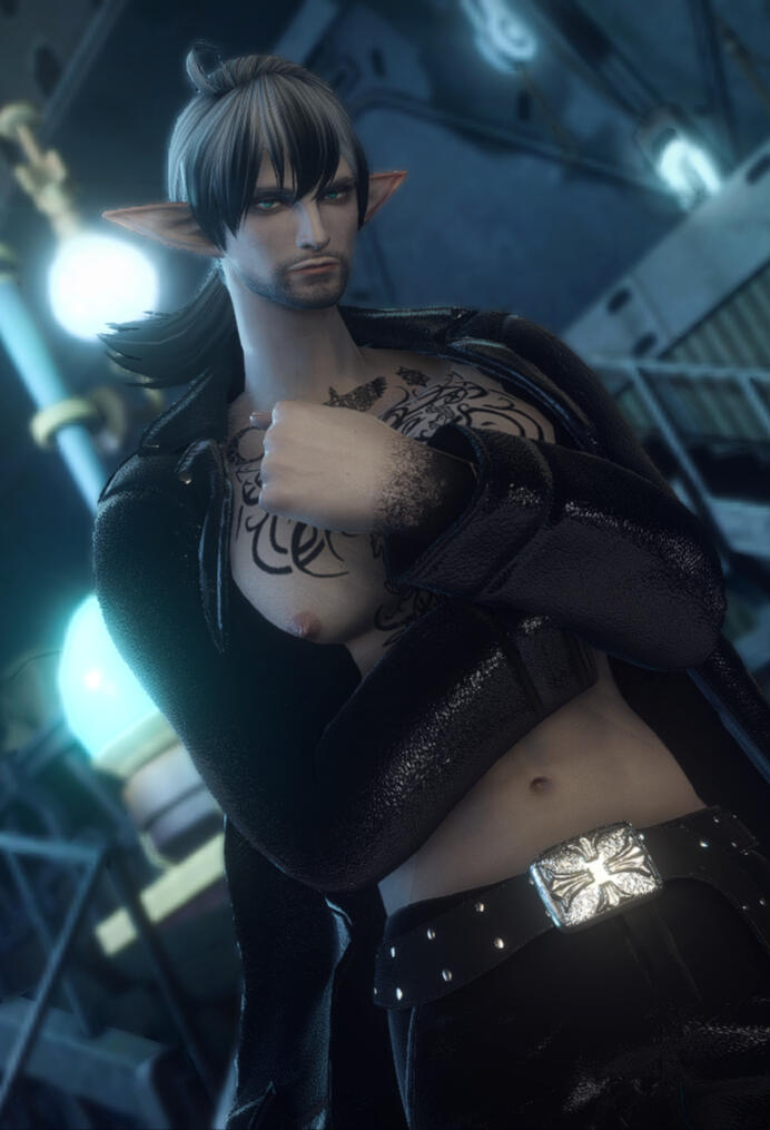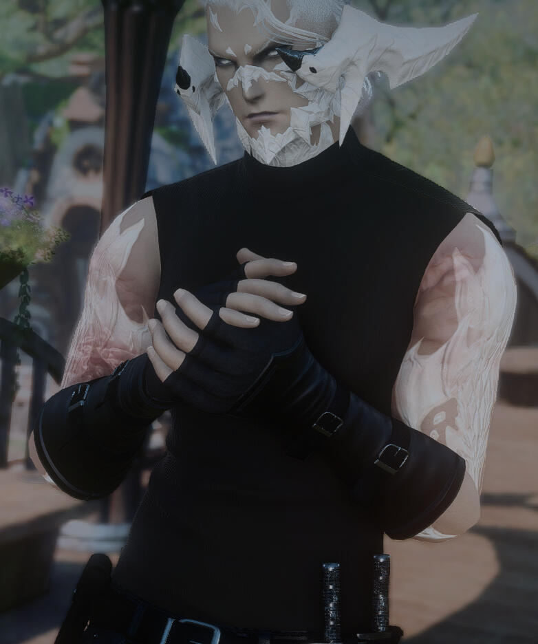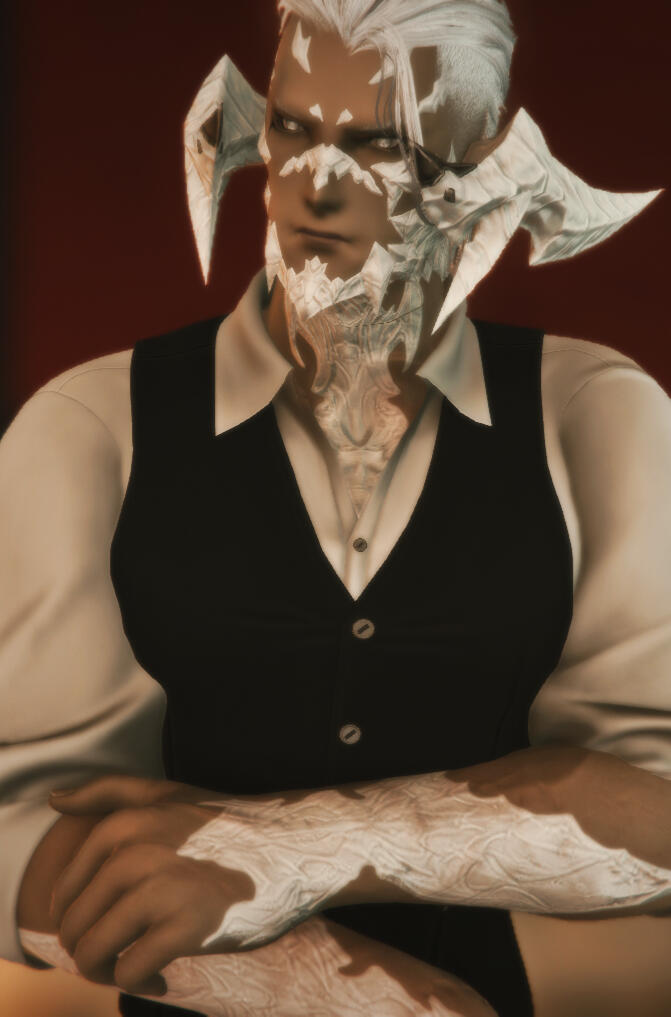 Notable Appearance Details: Ashen Grey Skin, Bright green eyes and the features that denote old Ishgardian bloodlines. His deep voice is deep in that old Ishgardian accent. His body is littered with tattoos including one hand being inked to black. His reputation as a lone wolf represented by the wolf in the wolf tattoo he got to embrace the rumors.