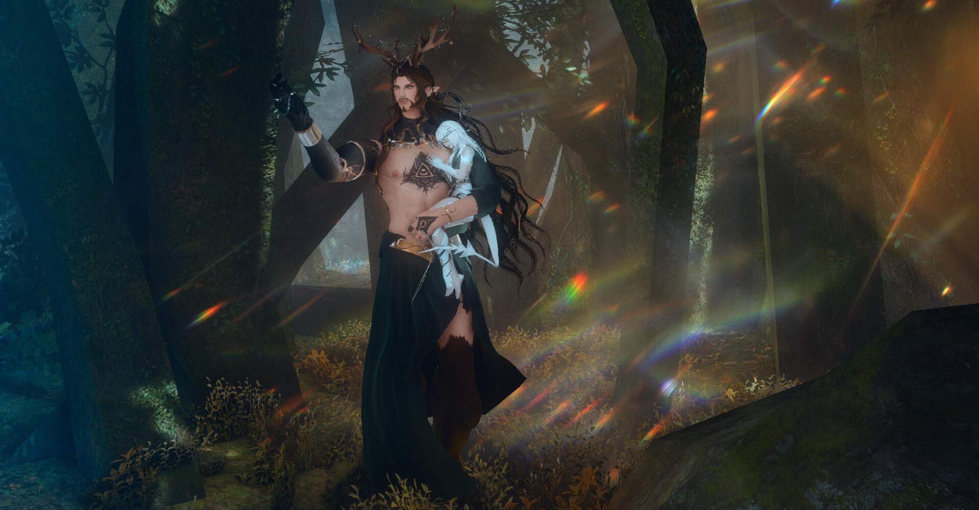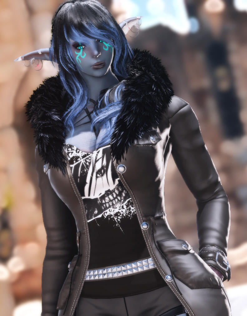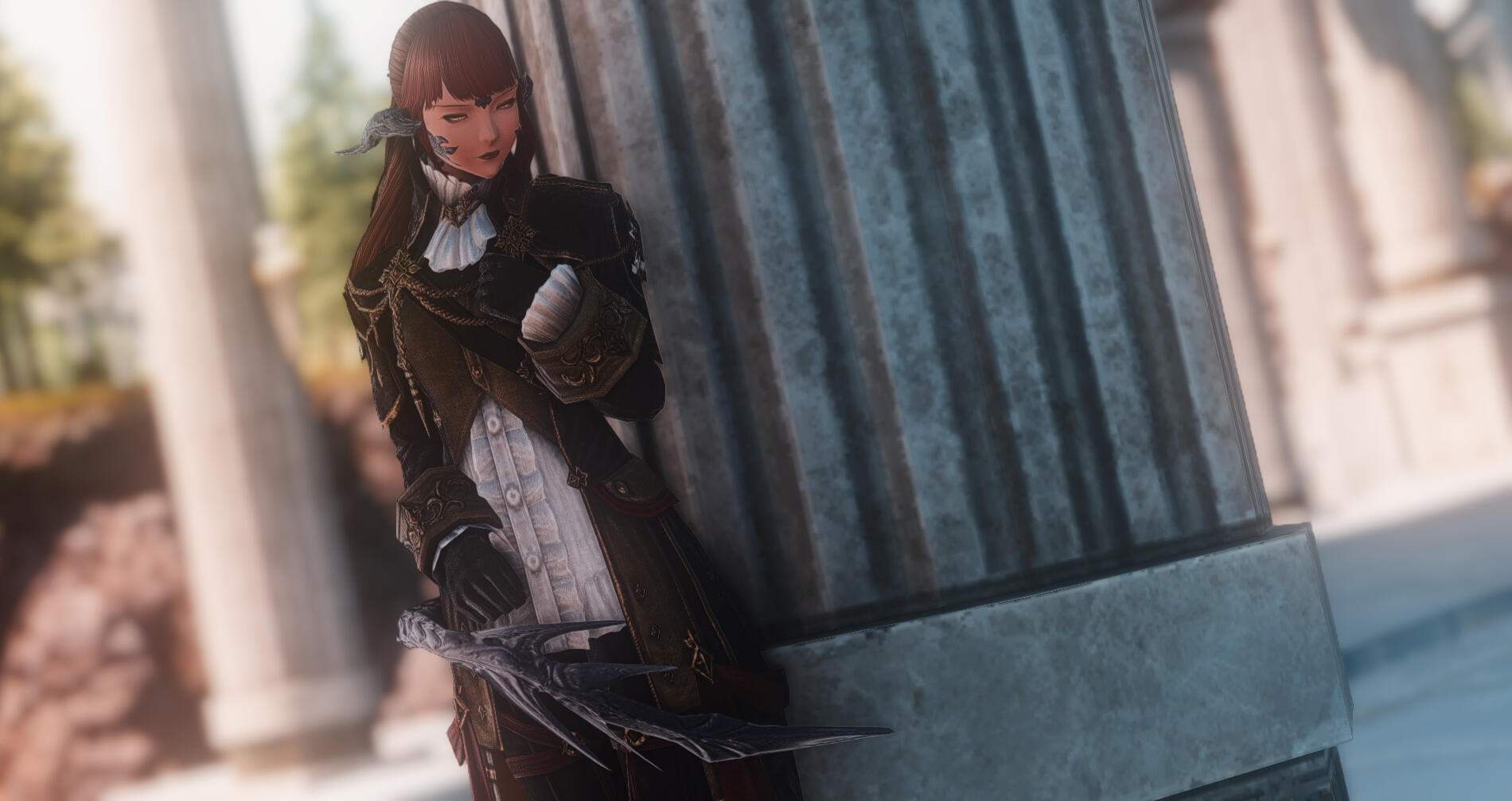 Notable Appearance Details: Ashen Grey Skin, Bright green eyes and the features that denote old Ishgardian bloodlines. His deep voice is deep in that old Ishgardian accent. His body is littered with tattoos including one hand being inked to black. His reputation as a lone wolf represented by the wolf in the wolf tattoo he got to embrace the rumors.