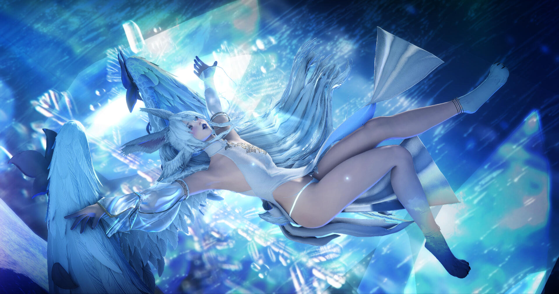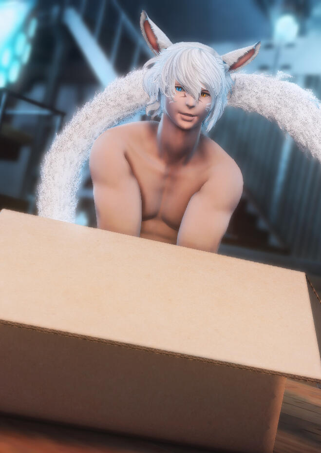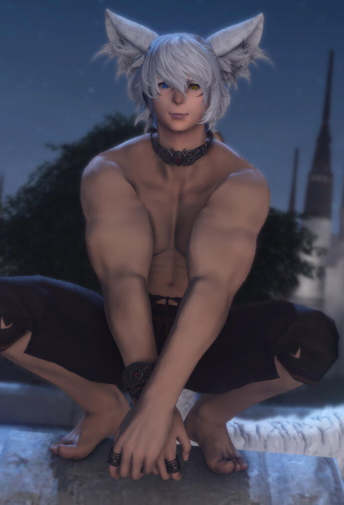 Notable Appearance Details: He appears to be a big miqo'te, taller than most races of Ethyris. Also strange well muscled. Large fluffy ears and a tail even bigger than he is!. Hetrochromic eyes and white hair and fur