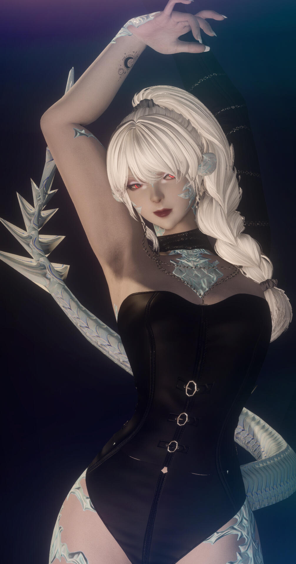 Reverie is a dragon from another universe, her preferred form is her draconic form which resembles an eastern style noodle dragon. However Vulispa had her develop a bi-pedal form that mostly resembles an xaela.... mostly she has elezen like ears poking out under her horns and the silvery marks of her shapeshifting magicks shimmer around her body with runes of her homeland.