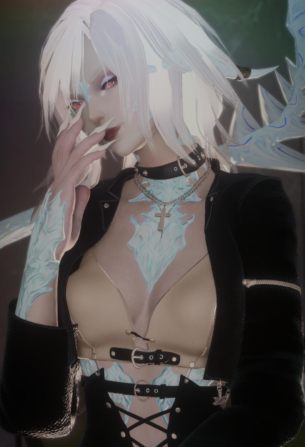 Notable Appearance Details: Extra scales down her hips and legs and up her back, Vulispa's scales shine a brilliant white with blue iridescent sheen. For the sake of quiet life however she often glamours these to appear like any other raen. She has a tattoo on her inner right wrist and her inch long claws on her fingers - normally manicured.